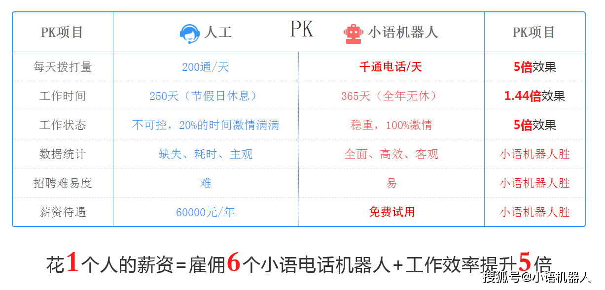 隨著時代的進步,現(xiàn)在的人工成本是一年比一年高,又要給員工開工資,又要給員工交社保,又是這個福利又是那個福利,可想而知成本有多高,而且人工還是需要休息的。但是呢,智能電銷機器人在這些方面就是要比人工打電話要好,它一年的成本有可能只是一個人工的一個月工資,而且它的工作效率是人工的三到五倍,真的是節(jié)省了人工成本還提高了工作效率了。