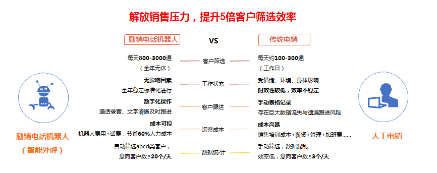 在成本上,機器人僅需花費定量的產品費用以及每月話費,而人工則需要投入大量的工資、獎金、培訓成本、加班費等等,差距懸殊。因此,啟用機器人后,節省下來的人力可被安排完成其他更重要的銷售任務。
