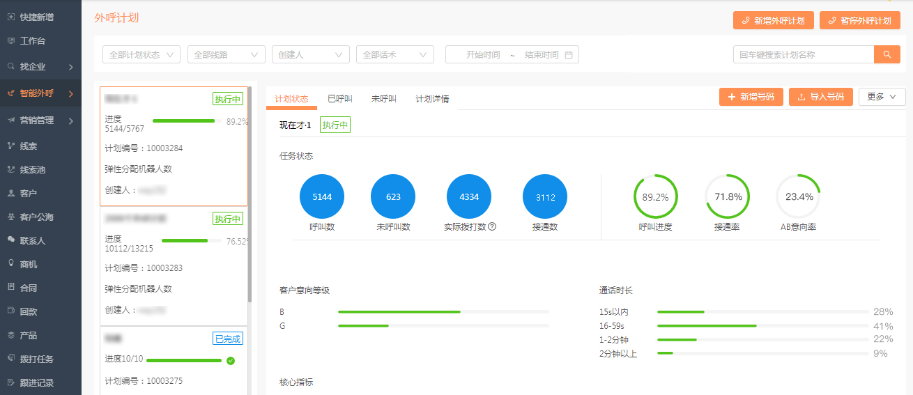大到總呼叫數、呼叫記錄、通話時長,小到接通率、有效通話數、對話輪次,這些不同層級的數據在外呼發生后的10分鐘內,均已可視化數據的形式呈現在機器人后臺,用戶可隨時登陸后臺進行查閱,及時調整外呼計劃、銷售話術,不必等到第二天。