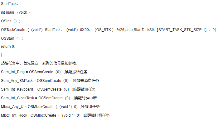 然后,用OSTaskCreate()函數建立6個任務。任務名分別為:HandsetTask(摘/掛機任務)、RingTask(響鈴任務)、KeyTask(鍵盤任務)、SmTask(短消息任務)、UITask(用戶界面(UI)任務)、ClockTask(時鐘任務)。最后,在起始任務中將它本身刪除掉。