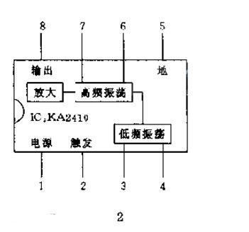 電路的工作過程:IC1的輸出脈沖是高電平時,IC2停止振蕩,電路不信號,當IC1輸出脈沖為低電平時,IC2的第1腳被接地,電路開始振蕩并振蕩信號,IC1輸出脈沖的低電平決定著輸出信號的間斷時間。