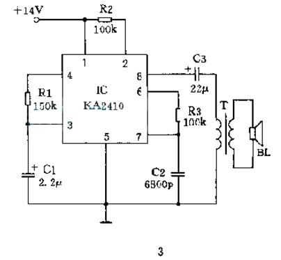 基于以上原理,只要改變IC的3、4腳和6、7腳的阻容元件數值,即可使輸出有警車聲、槍聲、門鈴聲、灑水聲等多種聲音。 典型應用如圖3所示。它可取代兩片NE555產生警報聲,且聲音更加逼真而引人注意。KA2410的輸出阻抗較高,如果用常見的低阻抗揚聲器輸出,最好用一只電話機振鈴專用變壓器匹配,這樣聲音效果更佳。如要求大功率輸出的場合,可加一級功率放大器。
