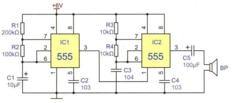 在電路中,兩個五五五與外圍阻容元件各自組成一個多諧振蕩器電路,其中IC1組成的是低頻振蕩電路,振蕩周期3至4秒。IC2組成的振蕩電路的頻率約500赫茲,IC1的信號輸出端第3腳和IC2的接地端第1腳是直接連接的,中間沒有任何電路元件,這種連接表明,IC1的輸出低頻矩形波對IC2的振蕩頻率的調制方式是直接調制的,即用矩形波來調制矩形波,因此IC2輸出的矩形波的前后沿仍然是原來的前后沿,沒有發生變化。而調制信號對IC2輸出矩形波的作用僅僅是使這個約500赫茲的音頻信號產生間斷,間斷時間由IC1輸出的低頻脈沖的周期決定。