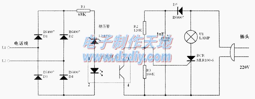 這款電話照明燈是根據電話機及光電耦合器、可控硅原理設計的,工作原理如下: