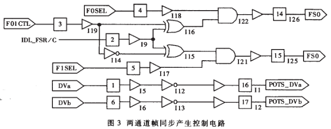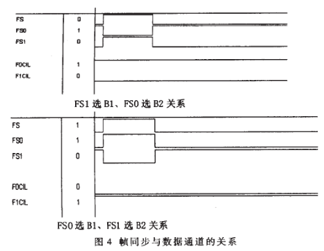 F0SEL、F1SEL是同步信號(hào)選擇信號(hào),為0選通有效,為1則選通無(wú)效。F01CTL是幀同步控制信號(hào),該信號(hào)在GAL16V8D內(nèi)將被一分為二為互為反相的兩幀同步信號(hào)控制信號(hào),它們與FS(IDL_FSR/C)幀同步信號(hào)異或產(chǎn)生選擇B1、B2數(shù)據(jù)通道的同步信號(hào)FS0、FS1。假設(shè)F01CTL被分F0SEL、F1SEL兩信號(hào)且它們有效,則它們的波形關(guān)系如圖4所示。