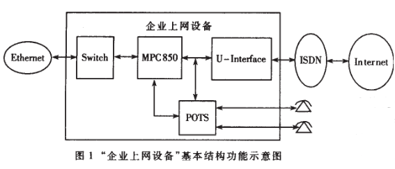 隨著網(wǎng)絡(luò)的發(fā)展,網(wǎng)絡(luò)帶這的增加,上網(wǎng)速度將越來(lái)越快。人們也不再僅限于上網(wǎng),在追求上網(wǎng)的同時(shí)打網(wǎng)絡(luò)電話,實(shí)現(xiàn)與網(wǎng)友的相互交流。目前人們很大程度上依賴于傳統(tǒng)的ISDN上網(wǎng),且在今后一段時(shí)間內(nèi),這種依賴不會(huì)發(fā)生很大變化。其于這種狀況,設(shè)計(jì)了針對(duì)企業(yè)的上網(wǎng)設(shè)備(簡(jiǎn)稱“企業(yè)上網(wǎng)設(shè)備”),它實(shí)現(xiàn)了企業(yè)上網(wǎng)的同時(shí)又可打網(wǎng)絡(luò)電話雙重功能。企業(yè)上網(wǎng)設(shè)備的整體實(shí)現(xiàn)方案如圖1所示。