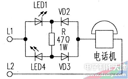 如果接聽電話后未把電話掛好,剛巧對方也沒掛好,往往會給使用者造成額外的經(jīng)濟損失。為此,筆者介紹一款新穎的電話附加裝置,該裝置能在電話使用完畢后,手柄未壓準(zhǔn)叉簧或免提鍵未復(fù)位,使通話后一直處于未掛斷狀態(tài)時發(fā)出報警提示。 工作原理:電路如附圖所示,當(dāng)電話摘機后接通電話機負載,外線脈沖電流正半周時,電流經(jīng)過LED1、R、VD3和電話機形成回路,LED1正向?qū)c亮,負半周時,電話機、VD2、R、LED4形成回路,電流流過LED4使LED4點亮,提示電話機工作,掛機后電流回路被切斷,LED熄滅,電話機不工作。R為流電阻,阻值大小視LED性能而定。該電路可裝在電源外線盒內(nèi),盒面上鉆二個小孔,露出LED1、LED4。如想要聲、光提示,可將嘀、嘀聲音樂片接在LED兩端。