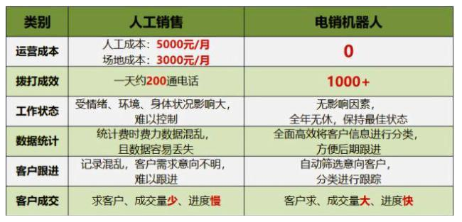 這時候,AI機器人電話的出現給他們提供了一種新的途徑,尤其是那些重度依賴電話營銷的行業,諸如地產、借貸、廣告推銷等等。相比于傳統的人類業務員,AI機器人電話操作簡單、管理方便、效率更高、成本更低,種種優點更好解決了以上企業的發展難題。