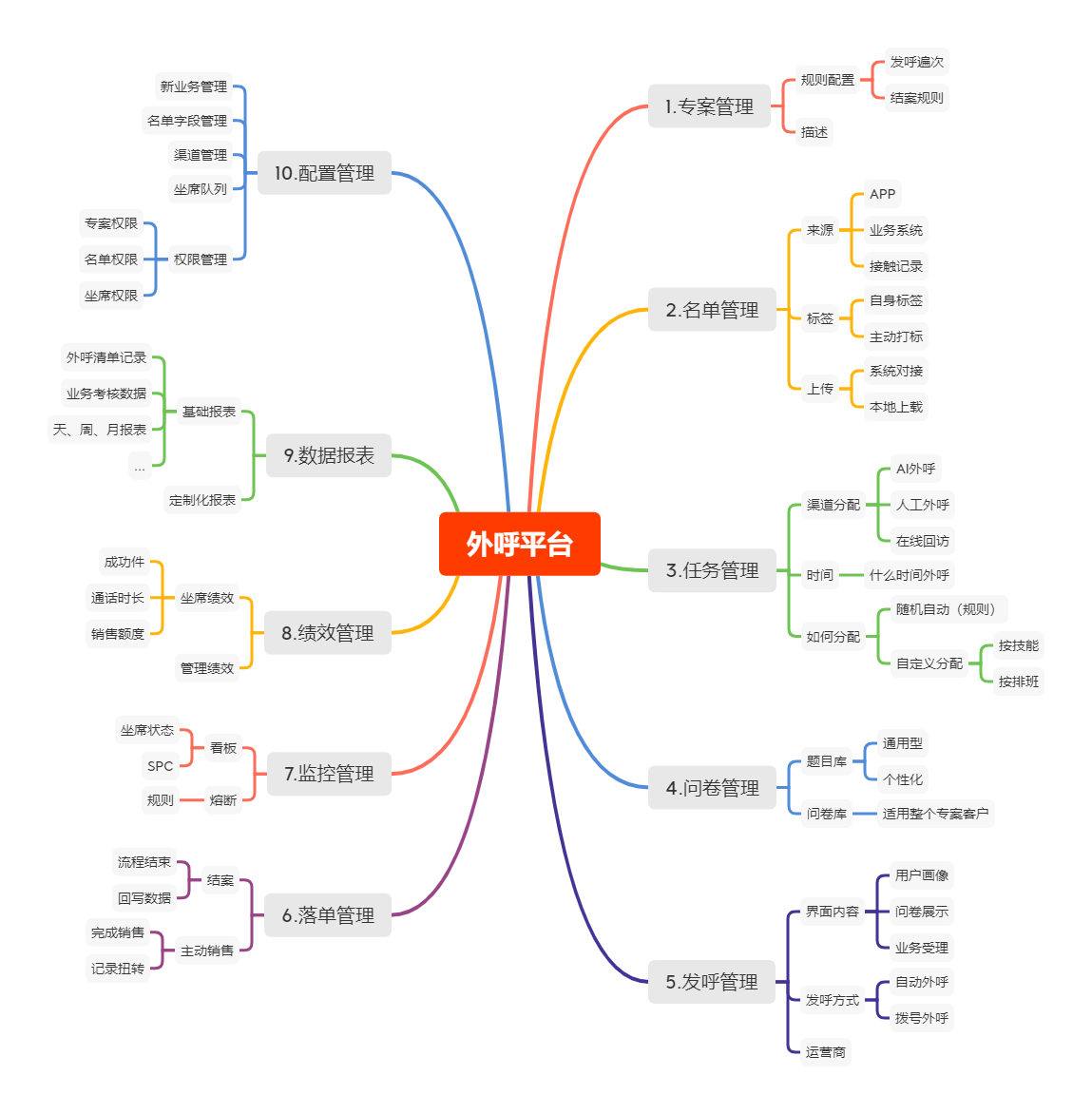實現外呼全流程的外呼系統包含如下模塊:專案管理、名單管理、任務管理、問卷管理、發呼管理、落單管理、監控管理、績效管理、數據報表、配置管理十大模塊,見如下例圖,后文也將分別介紹各個模塊含義和適用的業務場景。