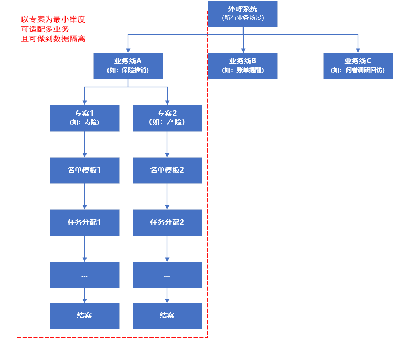 專案管理指:管理某一特定類型的外呼任務,比如:保險行業中監管要求的某一險種的外呼回訪和房地產行業中某一樓盤推銷的外呼,業務不一樣,外呼的內容和相關的規則不一樣,就需要單獨的管理。
