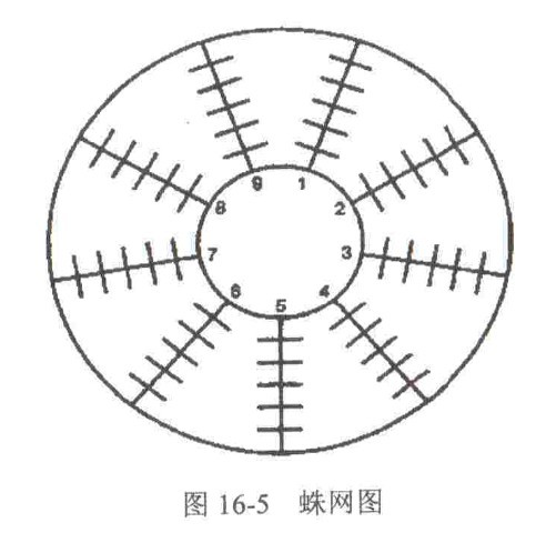 把表16-3中所得1分填入圖16-5所示蛛網圖最靠近圓心的地方、5分填入最靠近外圓的地方。