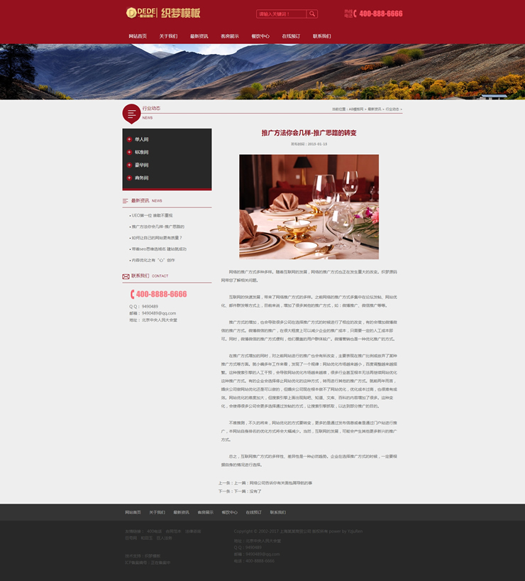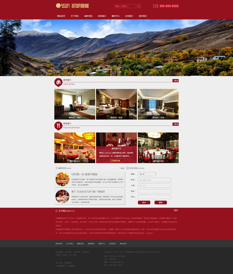 主頁 > 網站建設 > 網站模板 > 酒類、食品、服飾、服務 > 一款紅色酒店旅館網站源碼織夢餐飲酒店通用網