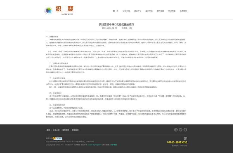 四、注意各個細節的處理,標題文字多余隱藏“…”代替,圖片ALT調用標題等,整站代碼兼顧SEO優化,代碼工整、非常有利于搜索引擎的蜘蛛抓取及收錄,確保網站的優化推廣更加簡單快捷。