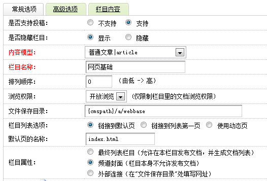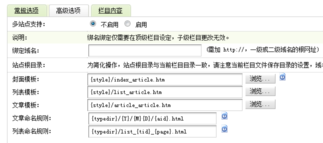 依此類推,如果在常規選項中欄目屬性是最終列表欄目,高級選項中封面模板為{style}/list_article.htm,則會調用list_article.htm作為模板,文檔模板也依此類推。