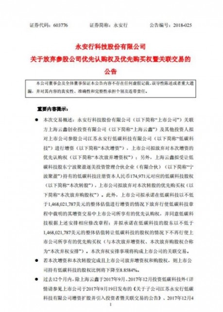《永安行科技股份有限公司關于放棄參股公司優先認購權及優先購買權暨關聯交易的公告》顯示,上海云鑫將以永安行低碳14.68億美元的整體估值增資20億元人民幣并受讓另一家機構股東部分股票,上市公司永安行則放棄對本次增資的優先認購權。