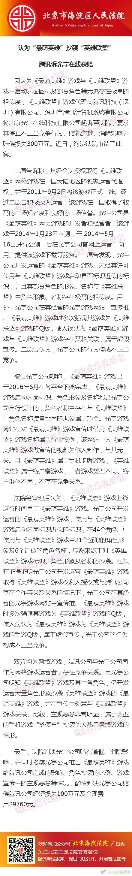 據海淀法院官方消息,因認為《最萌英雄》游戲與《英雄聯盟》游戲中啟動界面圖標及部分角色等元素存在極高的相似度,《英雄聯盟》游戲代理商騰訊科技(深圳)有限公司、深圳市騰訊計算機系統有限公司以構成不正當競爭為由將北京光宇在線科技有限公司訴至法院。