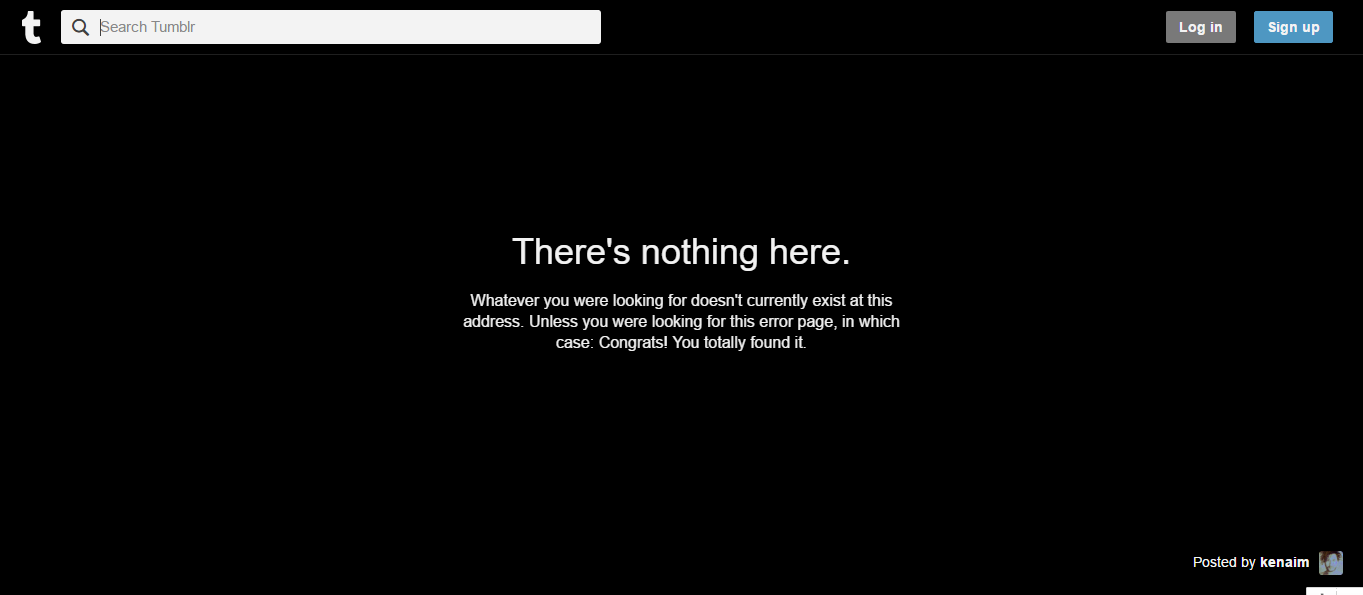 除此之外,404 現在也成為企業傳達品牌形象的工具。好比,當Tumblr的用戶拜候到某一不存在的網頁時,Tumblr 就很厚臉皮地體現「這里什么也沒有...... 除非你正在尋找這個錯誤頁面,要是真的,那么恭喜!你找到它了」。而皮克斯的 404 頁面則寫道:「噢...... 別哭了。這只是一個 404 錯誤!」旁邊還會配上一個哀痛的人像插圖。