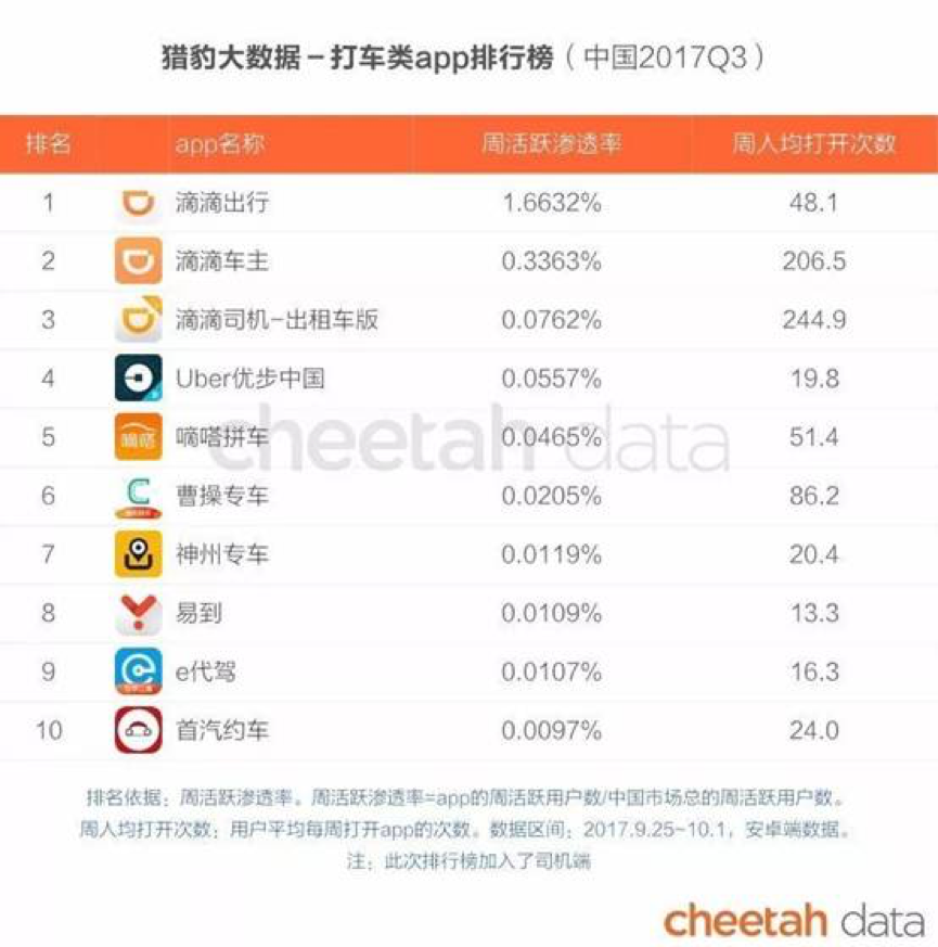 據(jù)獵豹大數(shù)據(jù)在本年Q3 的數(shù)據(jù)顯示,滴滴系已占據(jù)打車(chē)類(lèi)APP排行榜的前 4 名,僅滴滴出行周活躍滲透率,就已遠(yuǎn)超嘀嗒拼車(chē)、曹操專(zhuān)車(chē)、首汽約車(chē)等企業(yè)數(shù)據(jù)的總和。