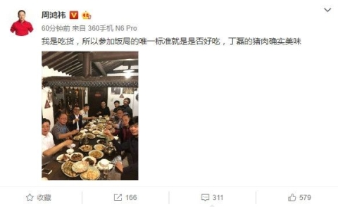我是吃貨,所以參加飯局的唯一尺度就是是否好吃,丁磊的豬肉確實美味 。——360董事長兼CEO周鴻祎