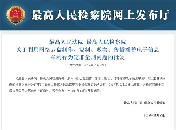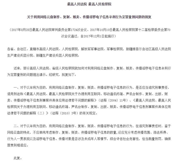 近日,《最高人民法院、最高人民檢察院關于利用網絡云盤制作、復制、販賣、傳播淫穢電子信息牟利行為定罪量刑問題的批復》將于 2017 年 12 月 1 日起施行。
