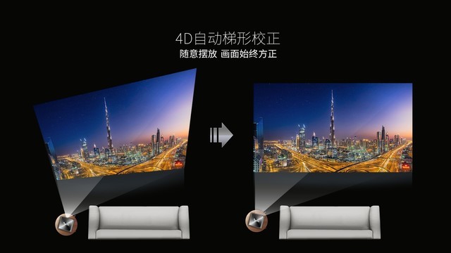投影多年發展,為何遲遲不能進入家庭?擺放是較大的攔路虎之一。多數人買了智能投影儀回家后發現,每次使用都要花上5- 10 分鐘部署和調試,才能看到方正清晰的畫面。尤其是在臥室使用時,適合投影的位置是床前大白墻,正對著墻的是一張舒服但是不能放投影機的床,很多用戶都撓頭:真不知道怎么才能把投影機對上白墻?而絕大多數人也不肯意在臥室里弄個穿墻鑿壁的天吊,更何況頂棚的燈具也不答應。適合的擺放位置就只剩床頭柜,可惜的是當你躺在床上就會發現呈現在眼前的是歪斜的畫面,"躺在床上看大片"的夢想根本無法實現。有些所謂新式的智能投影機增加了擺布梯形校正,嘗試解決這個問題,不過實際操作時要求用戶對四個角別離按著按鍵式遙控器一步步手調,這種繁瑣的操作讓許多買了這種投影機的伴侶用了一次就把它扔進抽屜,再無興趣進行第二次類似的體驗。