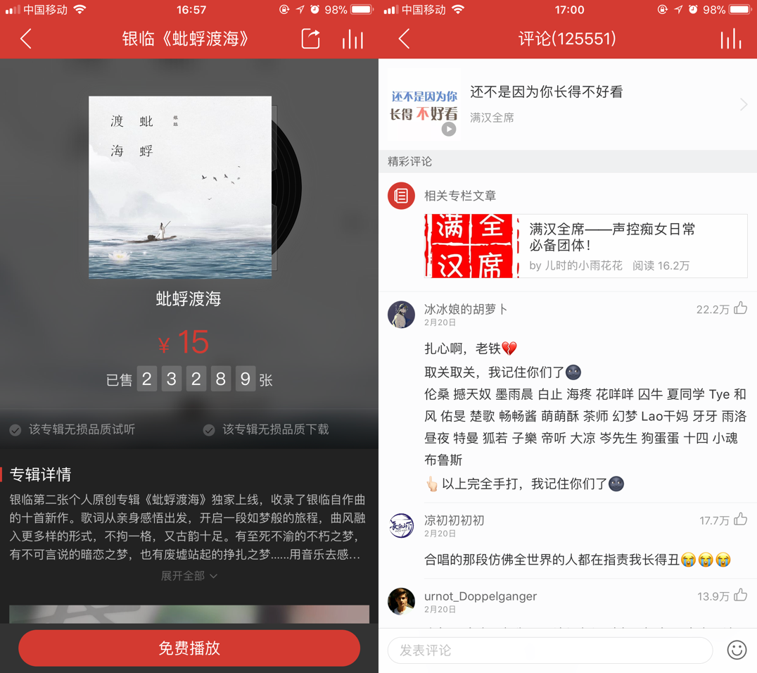 同樣,在互聯(lián)網(wǎng)音樂平臺(tái)上,國風(fēng)音樂的表示也十分突出。按照網(wǎng)易云音樂后臺(tái)數(shù)據(jù)顯示, 2016 年全年網(wǎng)易云音樂上國風(fēng)音樂的播放量同比增長374%,而像河圖、音頻怪物、HITA、蕭憶情、滿漢全席、銀臨等國風(fēng)音樂人,在網(wǎng)易云音樂上也都擁有很高的人氣。滿漢全席的熱門歌曲《還不是因?yàn)槟汩L得欠好看》,在網(wǎng)易云音樂上評(píng)論數(shù)超過12萬,而銀臨15元/張的數(shù)字專輯《蚍蜉渡海》,在網(wǎng)易云音樂售出23289張,無論從樂評(píng)數(shù)量還是銷售數(shù)字而言,都是令人振奮的成績。