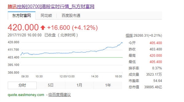 11 月 20 日,騰訊股價盤中大漲4.12%,收 420 港元,總市值高達39895. 48 億港元,首度超過 5000 億美元,成為亞洲首家市值超過 5000 億美元的公司。