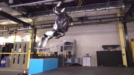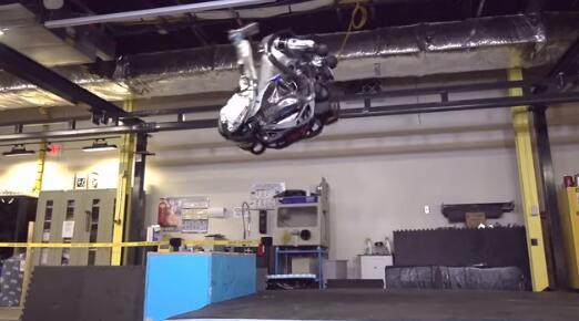 下面的視頻截圖展示了Atlas機(jī)器人做后空翻的過程,,它從一個(gè)平臺(tái)跳到另一個(gè)平臺(tái),然后來了一個(gè)后空翻。