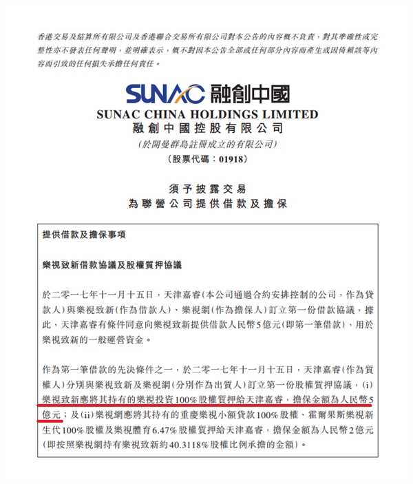 按照該公告, 2017 年 11 月 15 日,天津嘉睿(融創中國擺設控制的貸款人)與樂視致新(借款人)、樂視網(擔保人)簽訂第一份借款協議,天津嘉睿有條件向樂視致新提供借款人民幣 5 億元,用于樂視致新的一般運營資金。