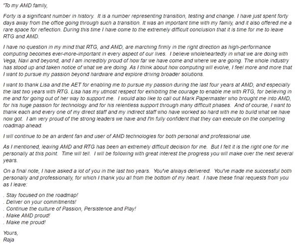 AnandTech稱,Hexus拿到的這份辭職信沒有得到AMD確認,但后者體現,Raja的確將從公司離任。