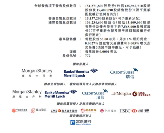 美國美銀美林、瑞士信貸、摩根士丹利為本次IPO的主承銷商,中金公司和摩根大通擔任聯席全球協調人。