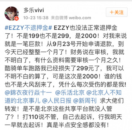 有用戶發布微博稱,從 9 月 23 號開始申請退款,到今天已經整整一個月了也沒有退換押金,財務一直在推脫說是在審核。