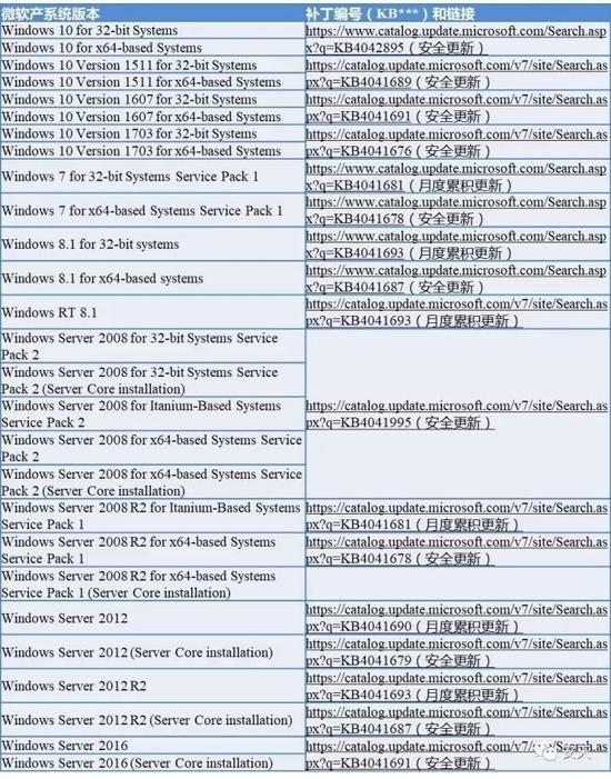 安天安適研究與應急處理中心(安天CERT)也整理了差別系統版本微軟官方補丁編號及參考鏈接,如表所示: