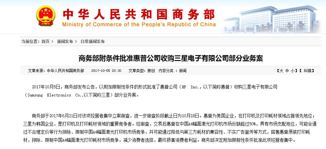 2017 年 10 月 5 日,商務部發布公告,以附加限制性條件的形式批準了惠普公司(HP Inc.,以下簡稱惠普)收購三星電子有限公司(Samsung Electronics Co.,,以下簡稱三星)部分業務案。