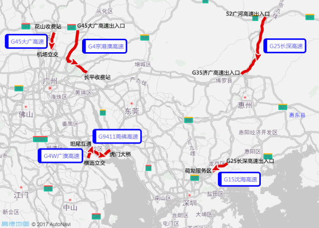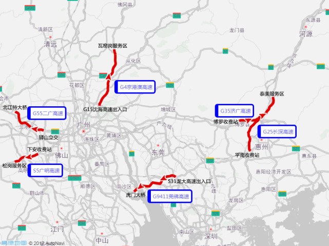 返程時(shí)段,珠三角地區(qū)五段最擁堵的高速則為G9411 莞佛高速(坦尾互通-虎門大橋)、G25 長深高速(S2 廣河高速出入口-G35 濟(jì)廣高速出入口)、G4 京港澳高速(G45 大廣高速出入口-長平收費(fèi)站)、G15 沈海高速(G25 長深高速出入口-荷坳辦事區(qū))和G45 大廣高速(花山收費(fèi)站-機(jī)場(chǎng)立交),擁堵時(shí)長均超過了 14 小時(shí)。