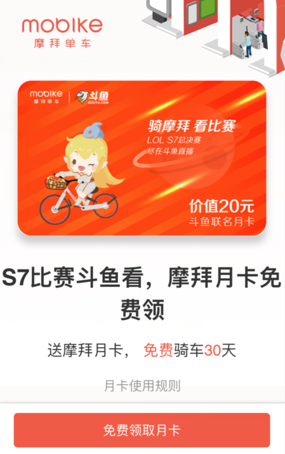 僅英雄聯(lián)盟區(qū)“S7全球總決賽”一個(gè)版塊,在斗魚上就有近千萬的不雅觀看用戶。而如安在直播屏幕之外,讓斗魚的品牌和優(yōu)質(zhì)內(nèi)容“走出來”,為更多年齡層、職業(yè)領(lǐng)域的用戶所了解,是一個(gè)更加有趣的挑戰(zhàn)。目前來看,與摩拜單車的跨界合作或許正在開辟出一條全新的道路,借由摩拜單車的線下資源,覆蓋城市廣泛的用戶群體,將斗魚品牌嵌入電競(jìng)、娛樂等用戶關(guān)注的熱點(diǎn)項(xiàng)目,以生活化的形式實(shí)現(xiàn)品牌的快速傳播。