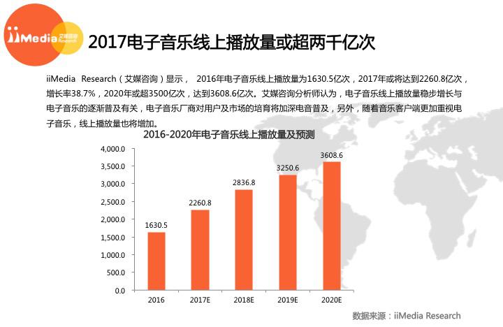 iiMedia Research(艾媒咨詢)顯示,2016 年電子音樂線上播放量為1630. 5 億次,, 2017 年或將達到2260. 8 億次,增長率38.7%, 2020 年或超 3500 億次,達到3608. 6 億次。艾媒咨詢分析師認為,電子音樂線上播放量穩步增長與電子音樂的逐漸普及有關,電子音樂廠商對用戶及市場的培育將加深電音普及,別的,隨著音樂客戶端更加重視電子音樂,線上播放量也將增加。