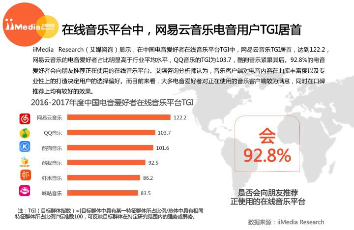 iiMedia Research(艾媒咨詢)顯示,在中國電音喜好者在線音樂平臺TGI中,網易云音樂TGI居首,達到122.2,網易云音樂的電音喜好者占比明顯高于行業平均水平,QQ音樂的TGI為103.7,酷狗音樂緊跟其后。