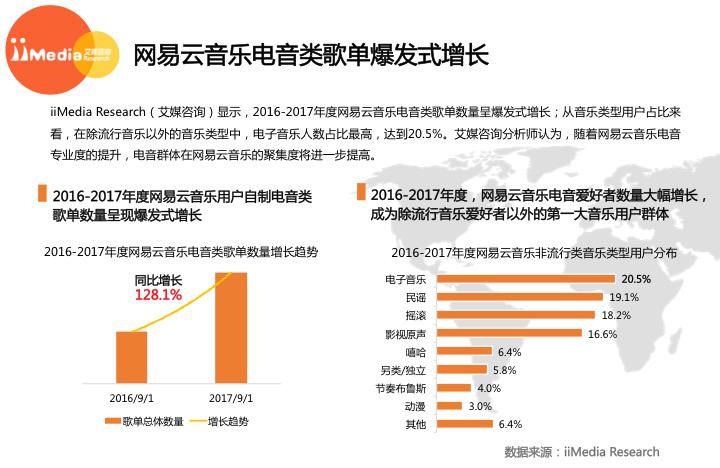 iiMedia Research(艾媒咨詢)顯示,2016- 2017 年度網易云音樂電音類歌單數量呈發作式增長;從音樂類型用戶占最近看,在除流行音樂以外的音樂類型中,電子音樂人數占比最高,達到20.5%。艾媒咨詢分析師認為,隨著網易云音樂電音專業度的提升,電音群體在網易云音樂的聚集度將進一步提高。