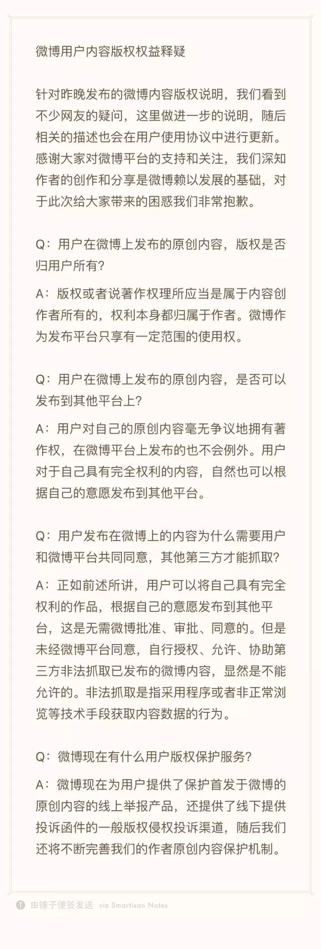 微博連夜發(fā)公告修改協(xié)議中不恰當(dāng)?shù)谋硎觯⒃?10 多個(gè)小時(shí)后再次發(fā)公告釋疑和報(bào)歉,稱用戶對(duì)本身的原創(chuàng)作品毫無(wú)爭(zhēng)議地?fù)碛兄鳈?quán),該條款僅針對(duì)未經(jīng)微博平臺(tái)同意的第三方不法抓取行為。此外,微博也體現(xiàn),上線了掩護(hù)首發(fā)于微博的原創(chuàng)內(nèi)容的線上舉報(bào)產(chǎn)品,將不停完善作者原創(chuàng)內(nèi)容掩護(hù)機(jī)制。