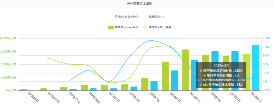 此外,艾瑞數據還顯示,在月度總有效時長方面,ofo同樣領先摩拜,ofo 8月的月度總有效時長為3508萬小時,摩拜的月度總有效時長為2823萬小時,ofo超出摩拜近20%。ofo 8月月度總使用次數為178455.1萬次,摩拜單車該指標為82752.39萬次,落后ofo 95702.71萬次,不足ofo的一半。