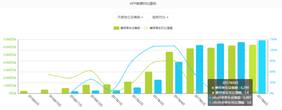 艾瑞8月份數據顯示,ofo月獨立設備數6887萬,摩拜單車月獨立設備數為6299萬,ofo領先摩拜588萬。ofo共享單車環比增幅3.6,是摩拜單車環比增幅1.4的近3倍。從兩大巨頭的對比圖上還可以看出,2017年上半年,摩拜單車連結著領先優勢,但是從2017年5月ofo開始反超摩拜,至2017年8月,ofo月獨立設備數已連續4個月排名第一,并一直連結快速增長趨勢,摩拜單車增速已現乏力。