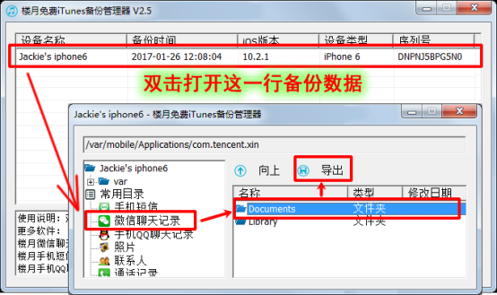 3,在同一電腦上安置并打開“樓月免費iTunes備份辦理器”,該軟件是一款用戶量較多的免費軟件,我們使用這款軟件的導出功能,把備份數據中存儲著微信聊天記錄的Documents文件夾導出到電腦上,詳細操作流程不才圖中進行了詳細的講解。