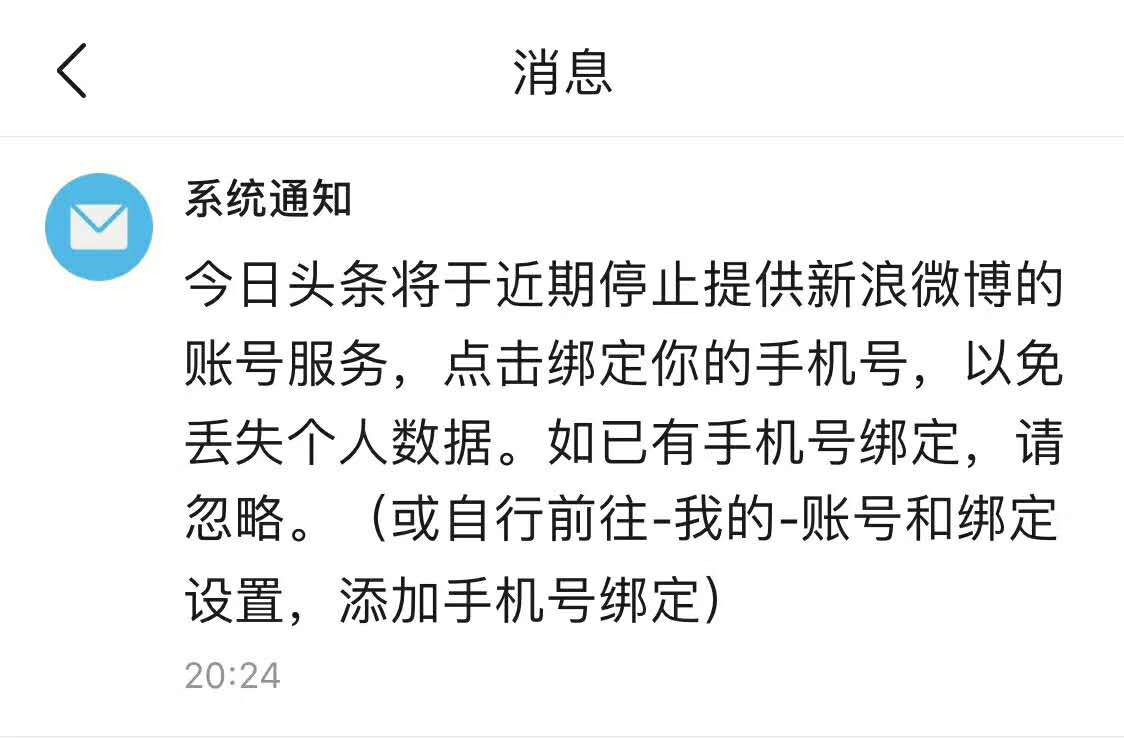 今日頭條將于近期停止提供新浪微博的賬號辦事,點擊綁定你的手機號,以免丟失個人數據。如已經手機號綁定,請忽略。(或自行前往-我的-賬號和綁定設置,添加手機號綁定)