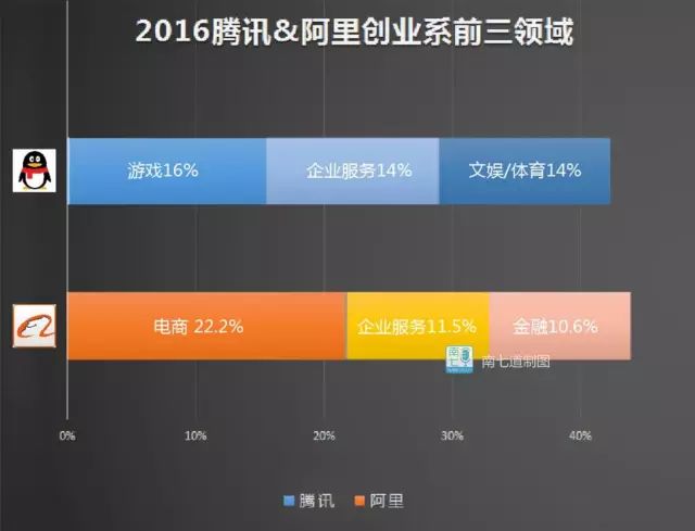 金融成為共同熱門領域:按照南極圈提供的數據,其收錄統計的 233 個騰訊系創業中,創業涉及的領域比較廣泛,但主要是集中在游戲(16%)、企業辦事(14%)、文娛/體育(14%)、互聯網金融(12%),有個特別要注意的數據是,社交獨霸天下的騰訊,它的離職員工在這個領域的創業者只占3%,一是面臨著騰訊QQ、微信強大的社交攻勢和壓力,別的一個就是社交離錢太遠了。要做大很難。而按照阿里創業組織前橙會提供的資料,阿里系創業前三領域別離是電商(22.2%)、企業辦事(11.5%)、金融(10.6%)。