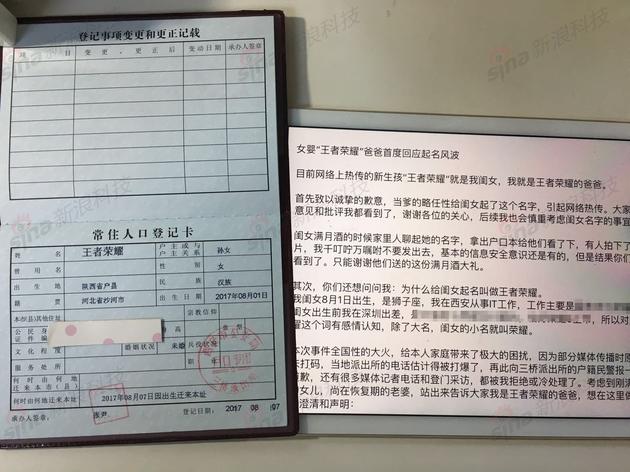 今日,一位自稱是陜西女嬰“王者榮耀”父親的王先生聯系新浪科技,體現對之前大火的起名事件進行回應。新浪科技求證后,對其進行了獨家采訪。他體現,本身并不玩王者榮耀,他的主要工作是移動開發工程師,因為工作關系取了這個名字,“我對榮耀這個詞有感情認知”。