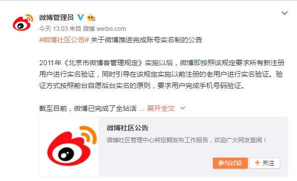 站長之家(Chinaz.com)9月8日消息:今天,@微博辦理員 發(fā)布微博:截至目前,微博已完成了全站活躍用戶的實(shí)名驗(yàn)證工作。按照相關(guān)法律要求,微博將在本年 9 月 15 日之前,完善產(chǎn)品機(jī)制,要求所有用戶包孕 2011 年之前注冊的用戶,在發(fā)博和評論前,先行完成實(shí)名驗(yàn)證。