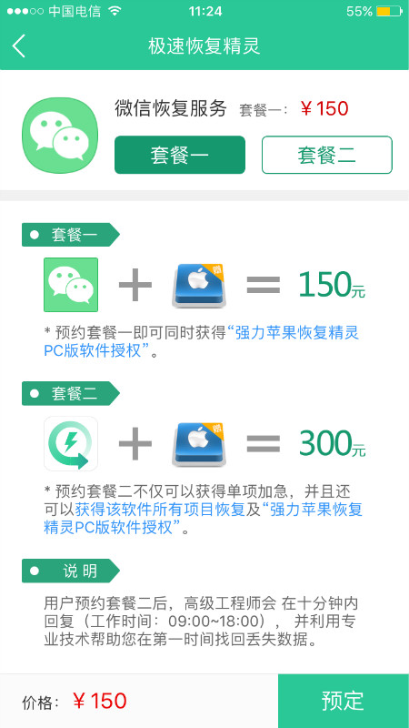 5.進入之后,大家要對微信聊天記錄恢復的辦事類型進行選擇,選擇完成后,我們點擊下方的“預定”進入。
