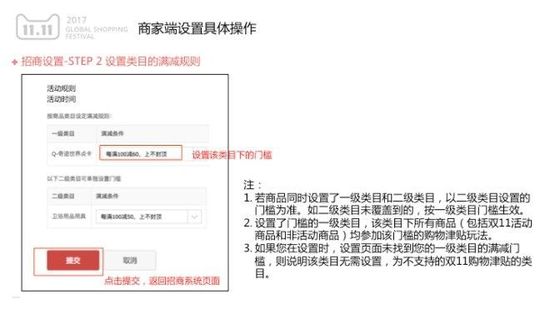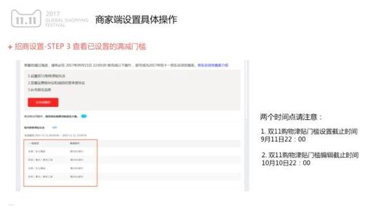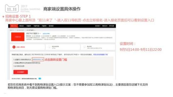 已經(jīng)入圍的店鋪商家,在 9 月 5 日至 9 月 11 日期間,要完成購物津貼設(shè)置、運(yùn)費(fèi)險協(xié)議、誠信經(jīng)營協(xié)議,及其他 2017 雙十一活動相關(guān)法律文本/增補(bǔ)報名信息的設(shè)置。