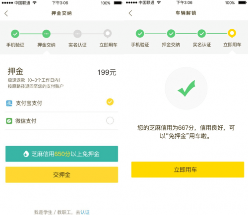 此外,用戶也可直接在支付寶App享受信用授權免押金辦事,支付寶用戶可打開“共享單車”功能選項即可使用,或者打開“芝麻信用”,點擊開啟“信用生活”中的ofo共享單車,完成信用授權即可免押金用車。